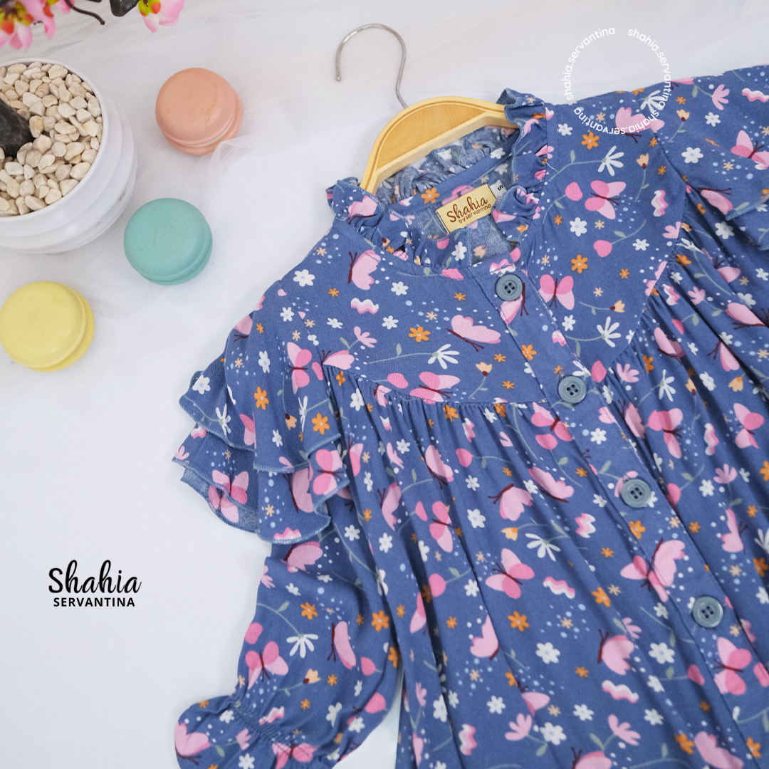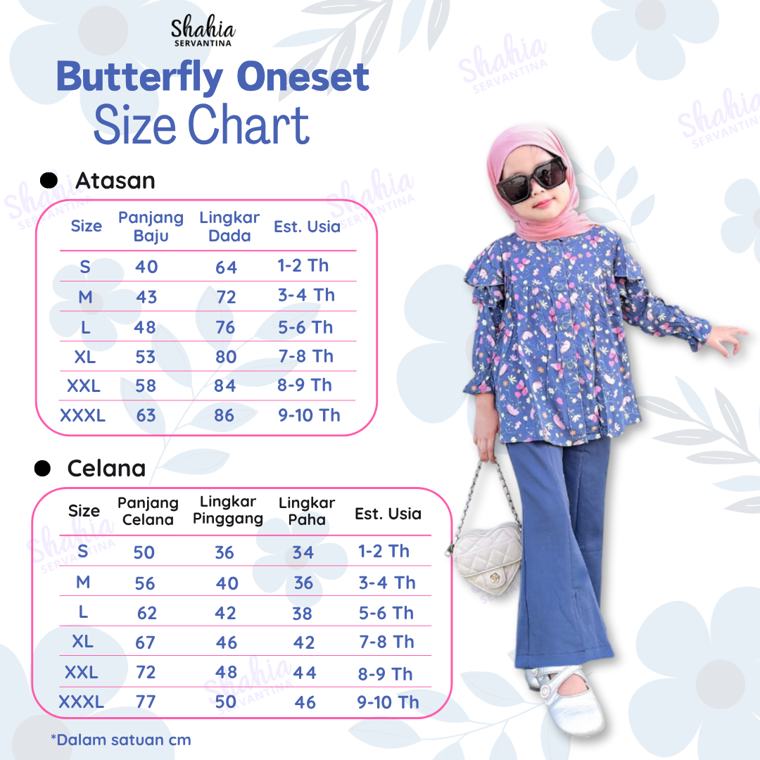 Butterfly Oneset terdiri dari 4 variasi warna yang super cute. Untuk atasan menggunaka Material Rayon dengan motif kupu-kupu yang terdapat ruflle bagian bahu kanan kiri, kancing aktif dibagian depan serta pergelangan tangan full karet. Untuk celana menggunakan material scuba premiun dengan belahan bagian depan serta sudah full karet pinggang.