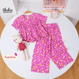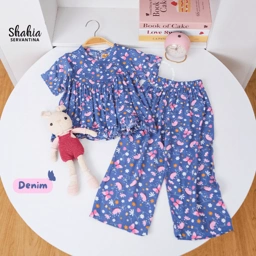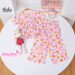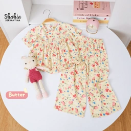 Cloe Oneset terdiri dari 4 variasi warna yang super cute. menggunaka Material Rayon dengan motif kupu-kupu yang terdapat ruflle bagian dada depan, kancing aktif dibagian belakang leher dengan potongan lengan pendek. Untuk celana sudah full karet pinggang.